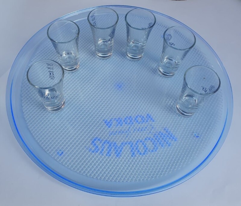 Nové, zabalené v krabici 12 ks pohárov Nicolaus (ryska 0,04 a 0,05 l) plus plastová (UV svietiaca) tácka s protišmykovou podložkou.